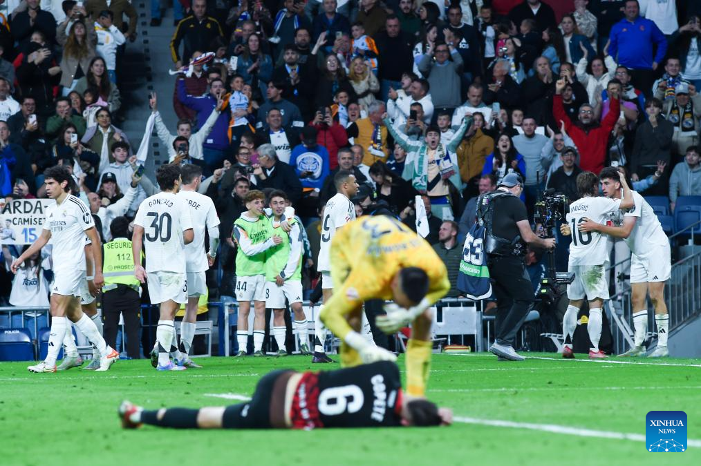Jacobo Ramon (1st R) of Real Madrid celebrates his goal with teammates during the Laliga football match between Real Madrid and RCD Mallorca in Madrid, Spain, on May 14, 2025. (Photo by Gustavo Valiente/Xinhua)