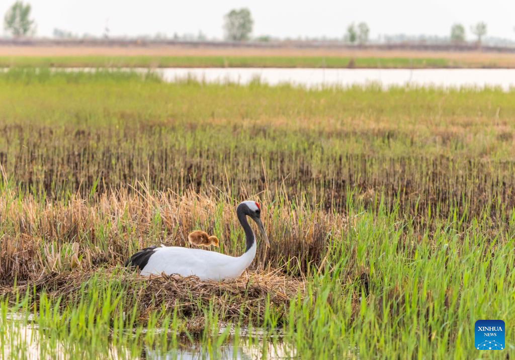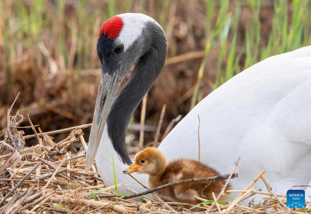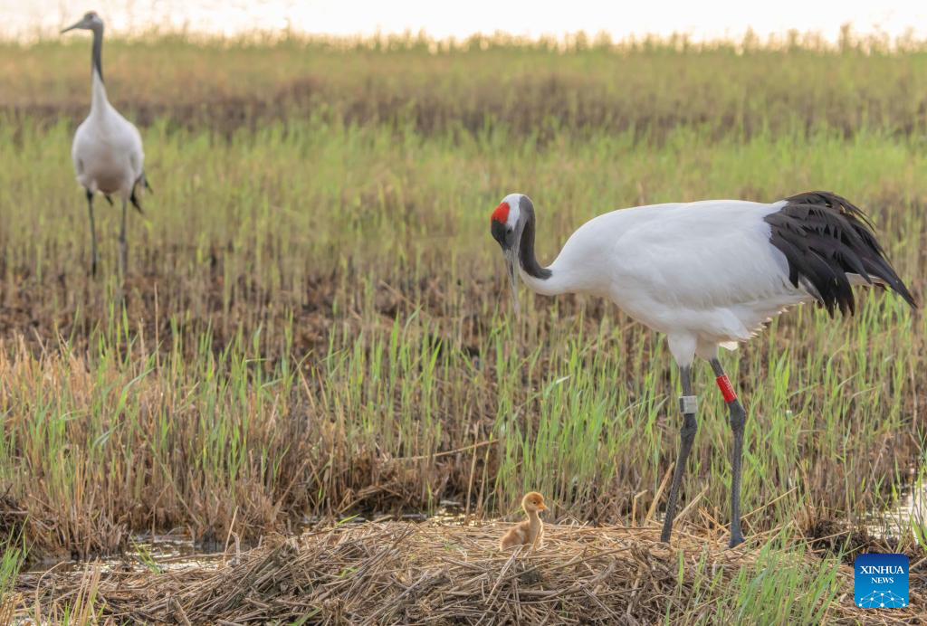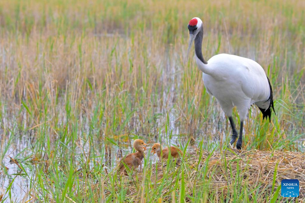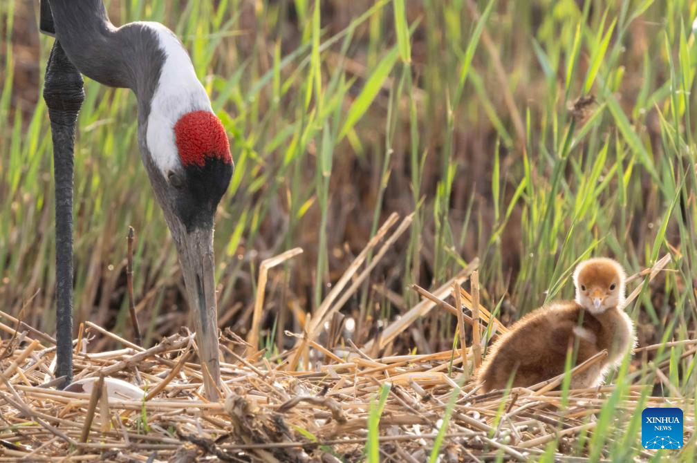 A red-crowned crane family is seen at Zhalong National Nature Reserve in Qiqihar, northeast China's Heilongjiang Province, May 14, 2025. (Photo by Wang Yonggang/Xinhua)