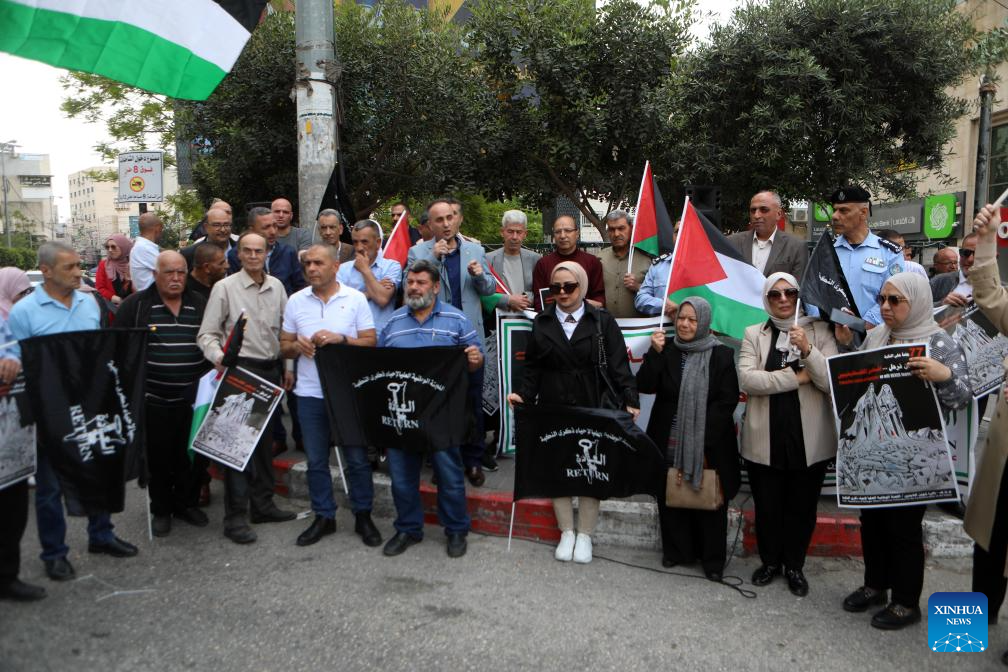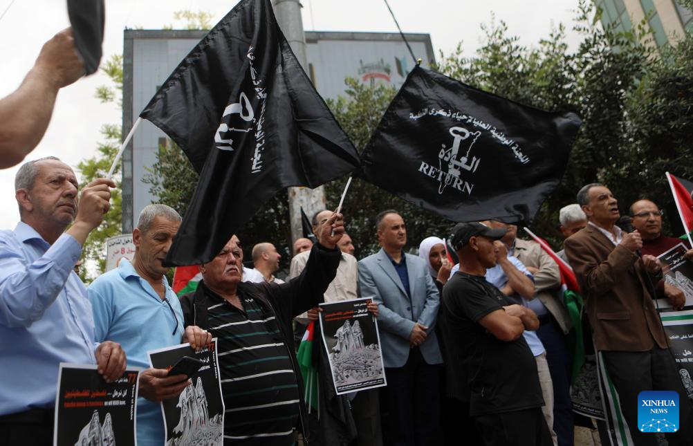 Palestinians participate in a public gathering to mark the 77th anniversary of Nakba in the southern West Bank city of Hebron, on May 14, 2025. Palestinians on Wednesday marked the 77th anniversary of Nakba, the massive exodus of Palestinians that occurred in 1948 following the establishment of the state of Israel. (Photo by Mamoun Wazwaz/Xinhua)