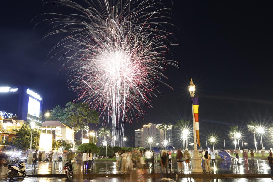 PHNOM PENH, May 15 (Xinhua) -- Fireworks lighted up the sky over the Tonle Sap River in front of the Royal Palace here Wednesday night to mark the 72nd birthday of Cambodian King Norodom Sihamoni.