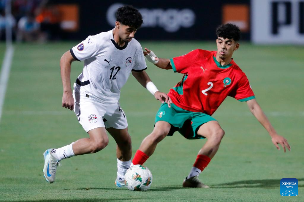Fouad Zahouani (L) of Morocco competes during the CAF U20 Africa Cup of Nations semi-final match between Egypt and Morocco in Cairo, Egypt, on May 15, 2025. (Xinhua/Ahmed Gomaa)
