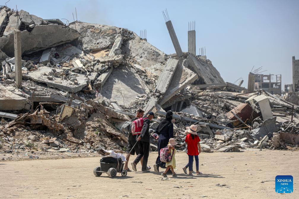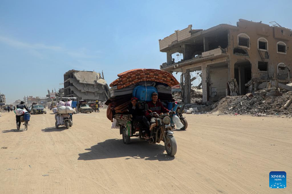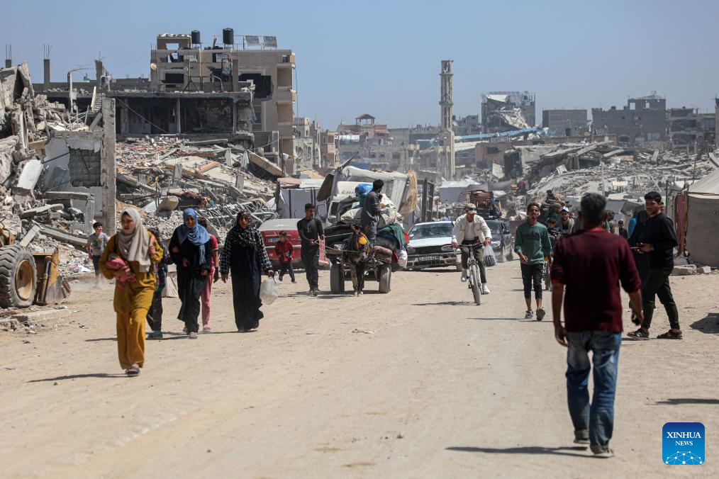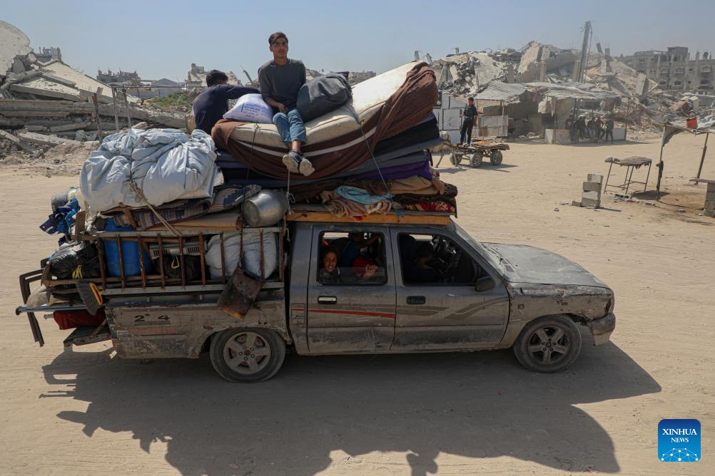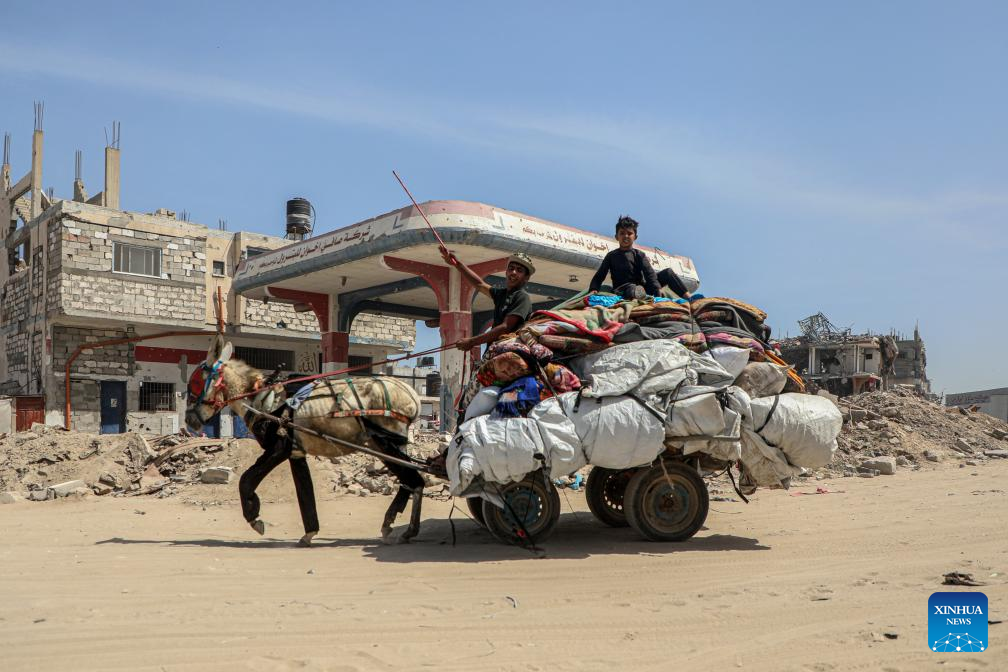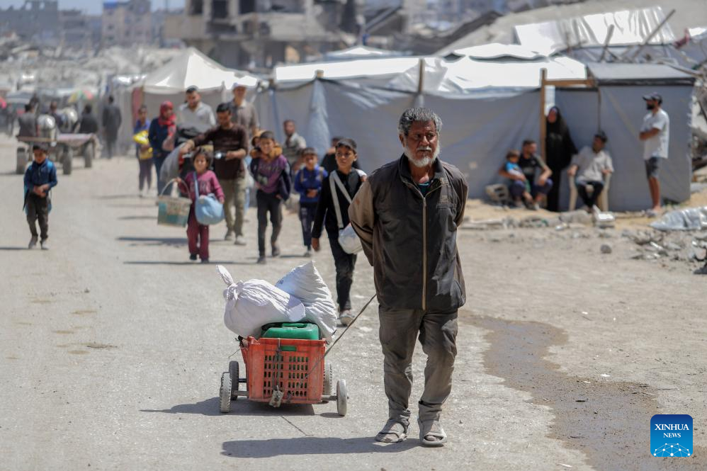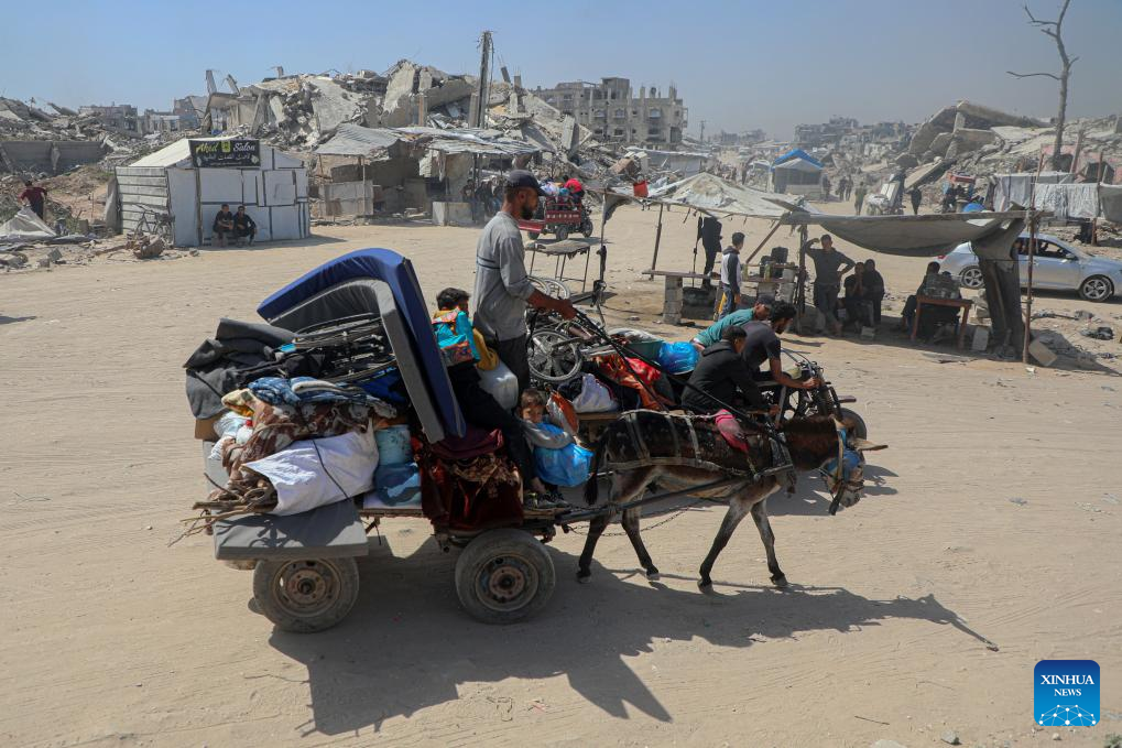 Displaced Palestinians are seen in Gaza City, as they flee with their belongings from Beit Lahia or Jabalia in northern Gaza Strip, on May 16, 2025. (Photo by Rizek Abdeljawad/Xinhua)