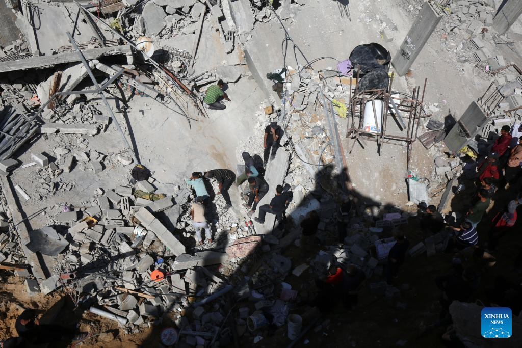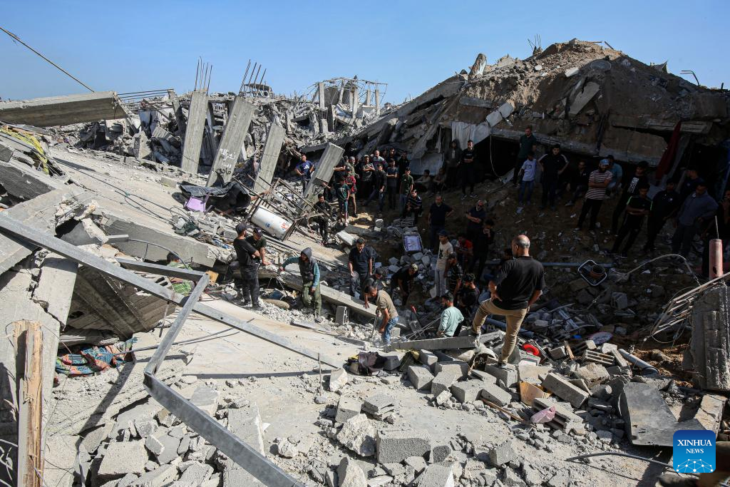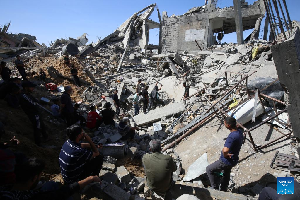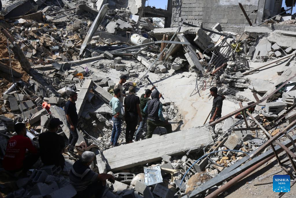 Palestinians inspect destroyed buildings after an Israeli airstrike in Jabalia refugee camp, northern Gaza Strip, on May 16, 2025. (Photo by Rizek Abdeljawad/Xinhua)