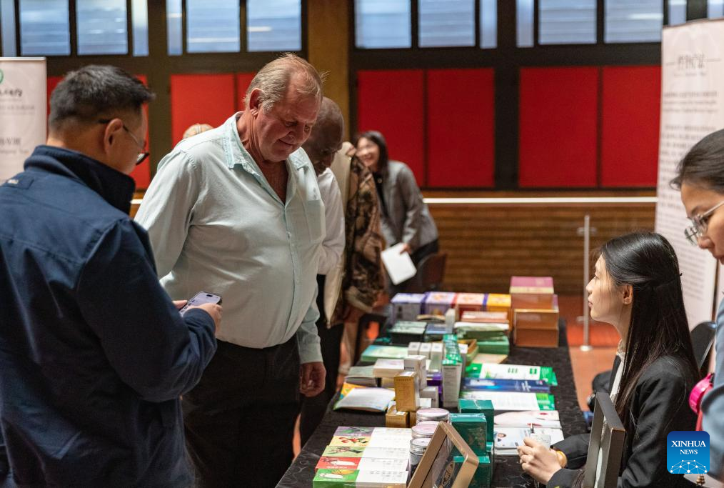 Visitors look at Traditional Chinese Medicine (TCM) products during the 2025 Sichuan TCM Cultural Exchange Tour in Johannesburg, South Africa, on May 16, 2025. (Xinhua/Zhang Yudong)