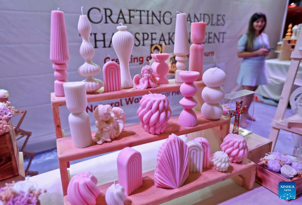 A woman displays products at the Made in Lebanon Exhibition 2025 in Beirut, Lebanon, on May 15, 2025. Held here from May 15 to 19, the Made in Lebanon Exhibition 2025 brings together over 350 exhibitors in an exhibition area of 14,000 square meters. (Xinhua/Bilal Jawich)