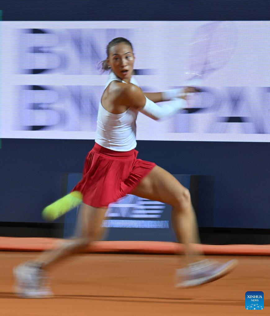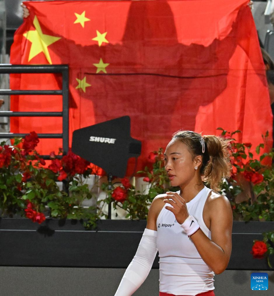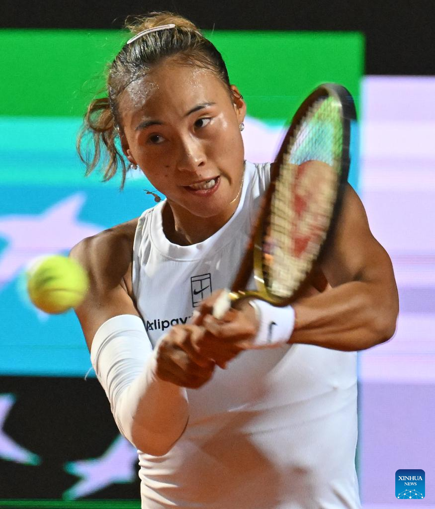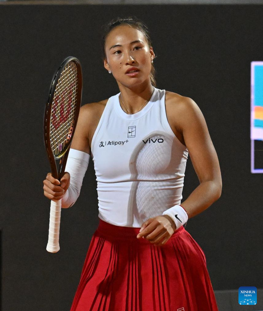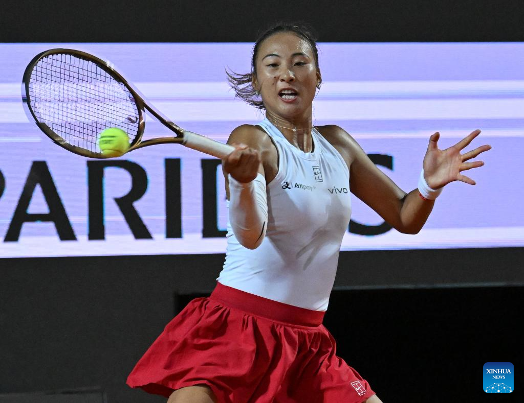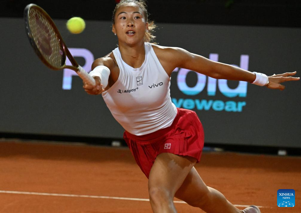 Zheng Qinwen returns a shot during the women's singles semifinal match between Zheng Qinwen of China and Coco Gauff of the United States at the WTA Italian Open in Rome, Italy, May 15, 2025. (Photo by Alberto Lingria/Xinhua)