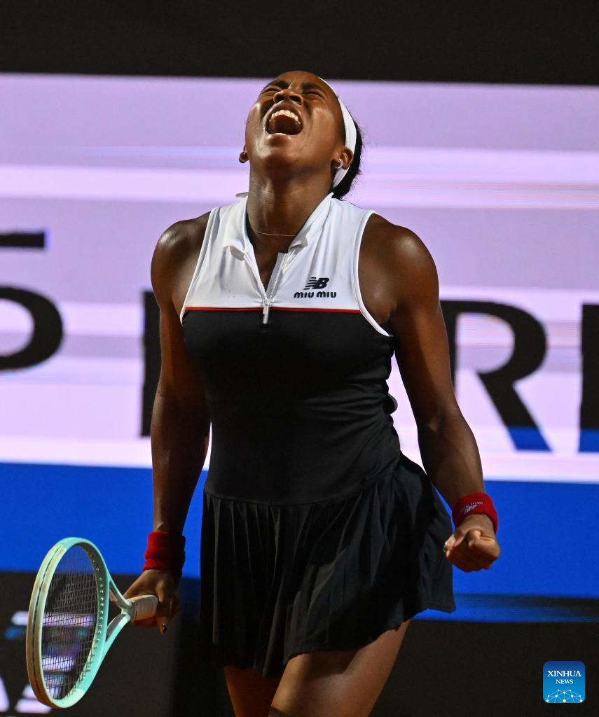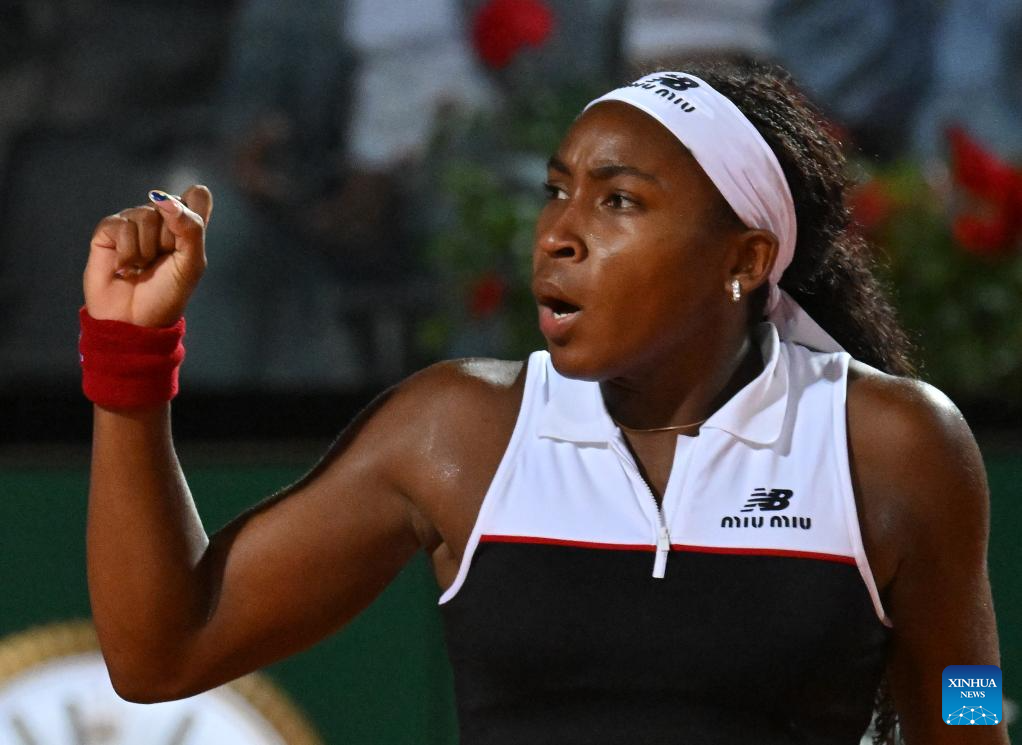 Coco Gauff celebrates after winning the women's singles semifinal match between Zheng Qinwen of China and Coco Gauff of the United States at the WTA Italian Open in Rome, Italy, May 15, 2025. (Photo by Alberto Lingria/Xinhua)