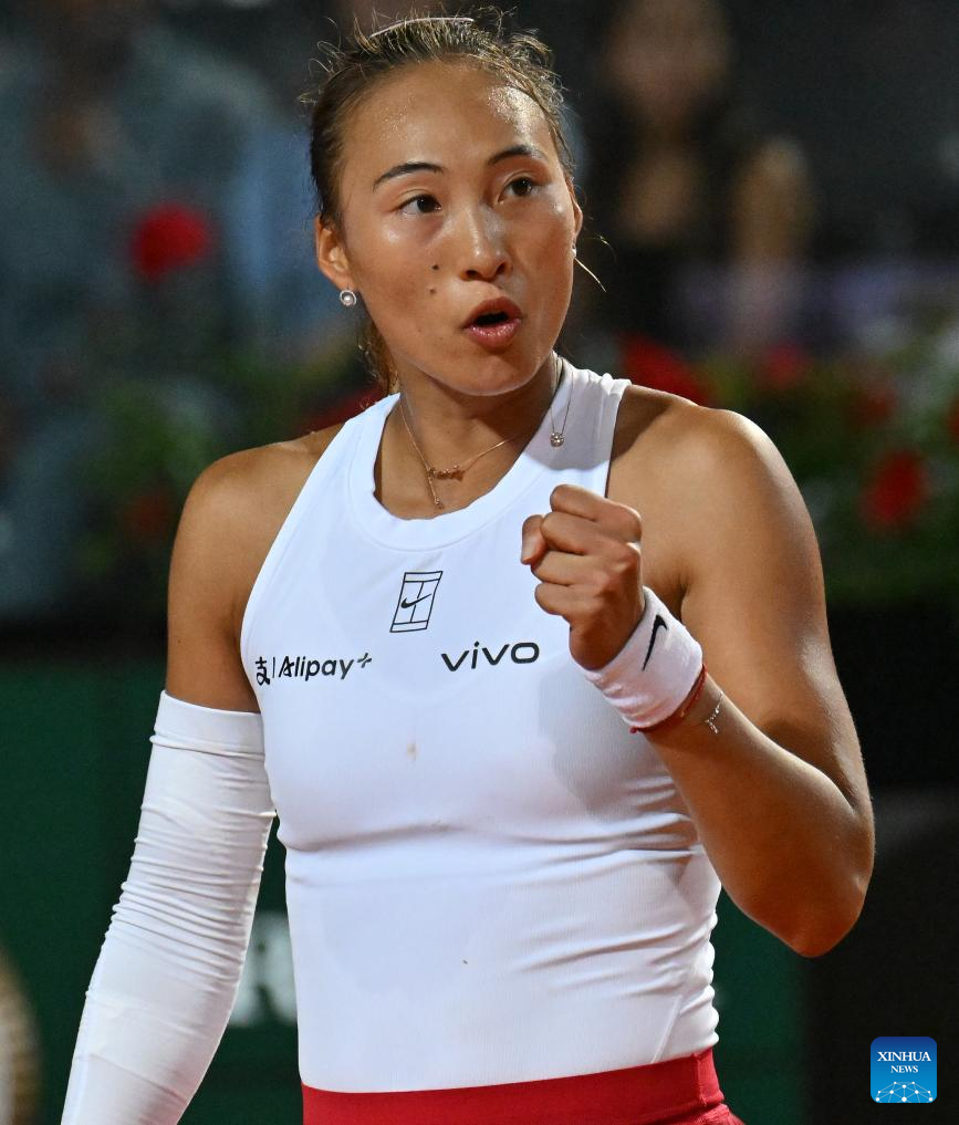 Zheng Qinwen celebrates a point during the women's singles semifinal match between Zheng Qinwen of China and Coco Gauff of the United States at the WTA Italian Open in Rome, Italy, May 15, 2025. (Photo by Alberto Lingria/Xinhua)