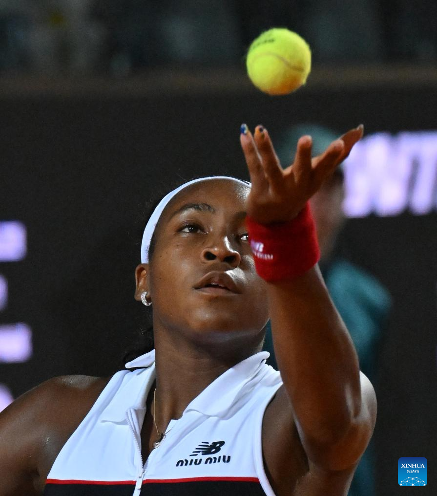 Coco Gauff serves during the women's singles semifinal match between Zheng Qinwen of China and Coco Gauff of the United States at the WTA Italian Open in Rome, Italy, May 15, 2025. (Photo by Alberto Lingria/Xinhua)