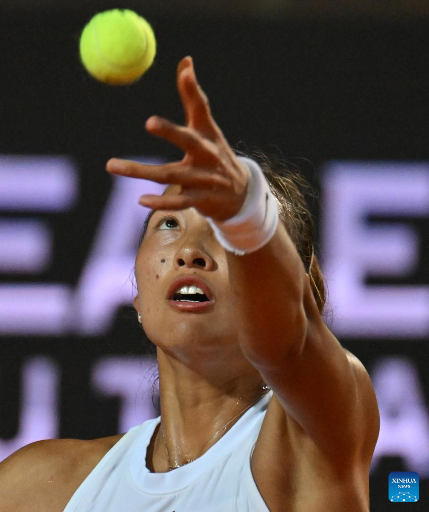 Zheng Qinwen serves during the women's singles semifinal match between Zheng Qinwen of China and Coco Gauff of the United States at the WTA Italian Open in Rome, Italy, May 15, 2025. (Photo by Alberto Lingria/Xinhua)