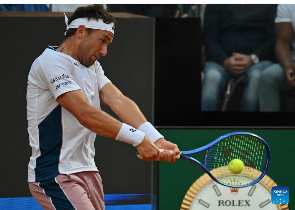 Casper Ruud returns a shot during the men's singles quarter final match between Jannik Sinner of Italy and Casper Ruud of Norway at the ATP Italian Open in Rome, Italy, May 15, 2025. (Photo by Alberto Lingria/Xinhua)