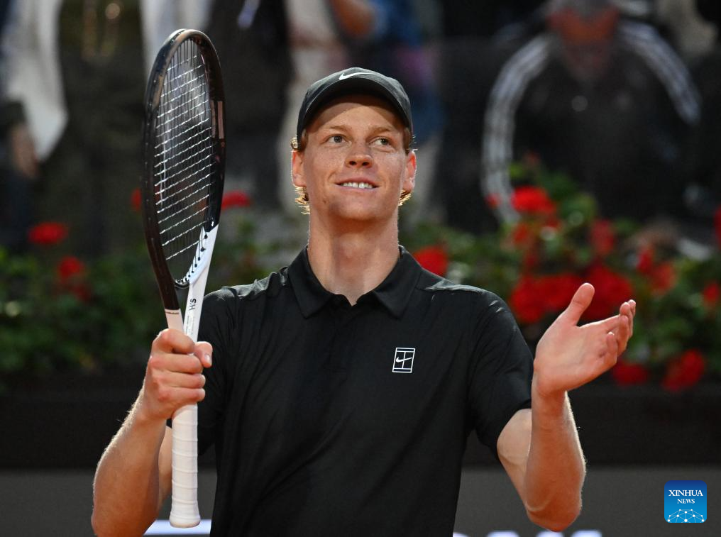 Jannik Sinner celebrates after winning the men's singles quarter final match between Jannik Sinner of Italy and Casper Ruud of Norway at the ATP Italian Open in Rome, Italy, May 15, 2025. (Photo by Alberto Lingria/Xinhua)