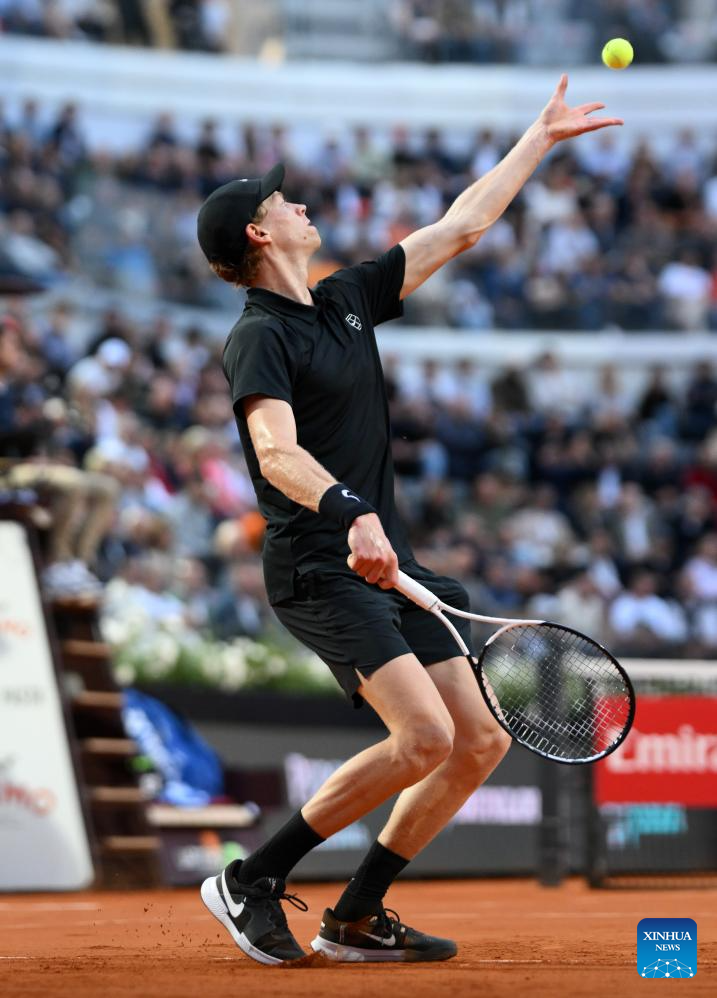 Jannik Sinner serves during the men's singles quarter final match between Jannik Sinner of Italy and Casper Ruud of Norway at the ATP Italian Open in Rome, Italy, May 15, 2025. (Photo by Alberto Lingria/Xinhua)