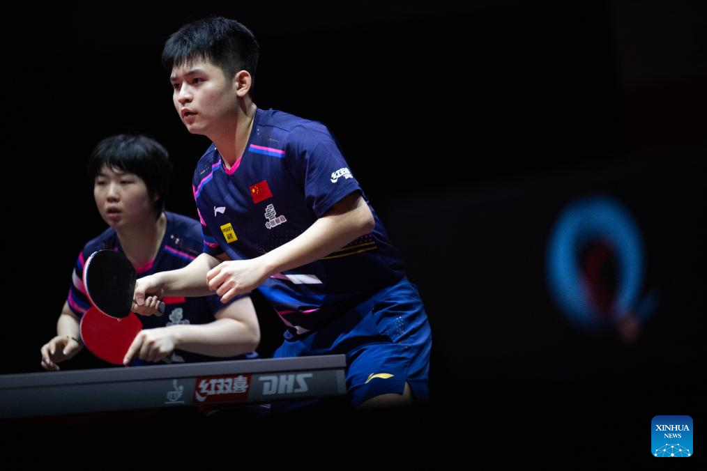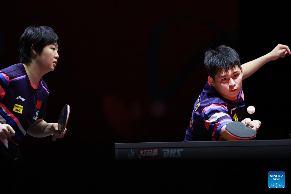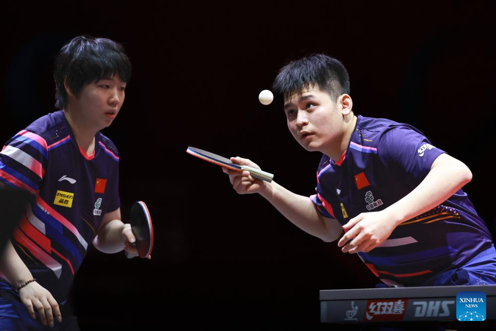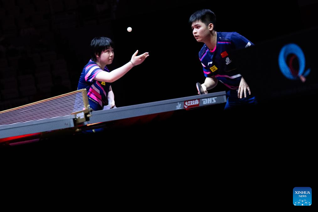 Lin Shidong (R) and Kuai Man compete during the mixed doubles round of 64 match between Lin Shidong/Kuai Man of China and Liam Pitchford (England)/Anna Hursey (Wales) at ITTF World Table Tennis Championships Finals Doha 2025 in Doha, Qatar, May 17, 2025. (Xinhua/Liu Xu)