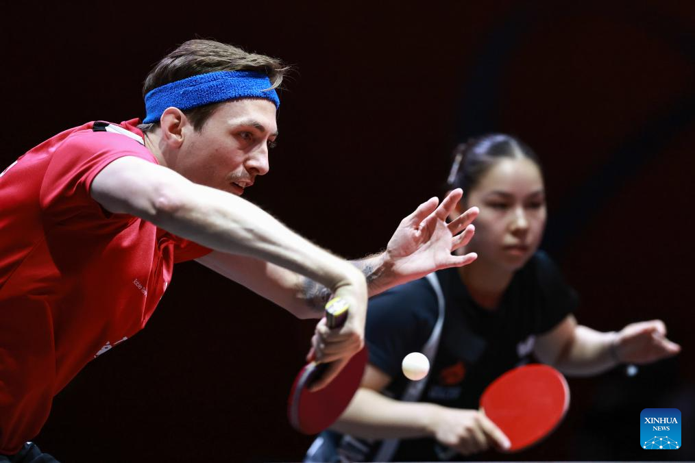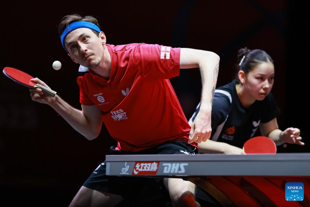 Liam Pitchford (L) and Anna Hursey compete during the mixed doubles round of 64 match between Lin Shidong/Kuai Man of China and Liam Pitchford (England)/Anna Hursey (Wales) at ITTF World Table Tennis Championships Finals Doha 2025 in Doha, Qatar, May 17, 2025. (Xinhua/Liu Xu)