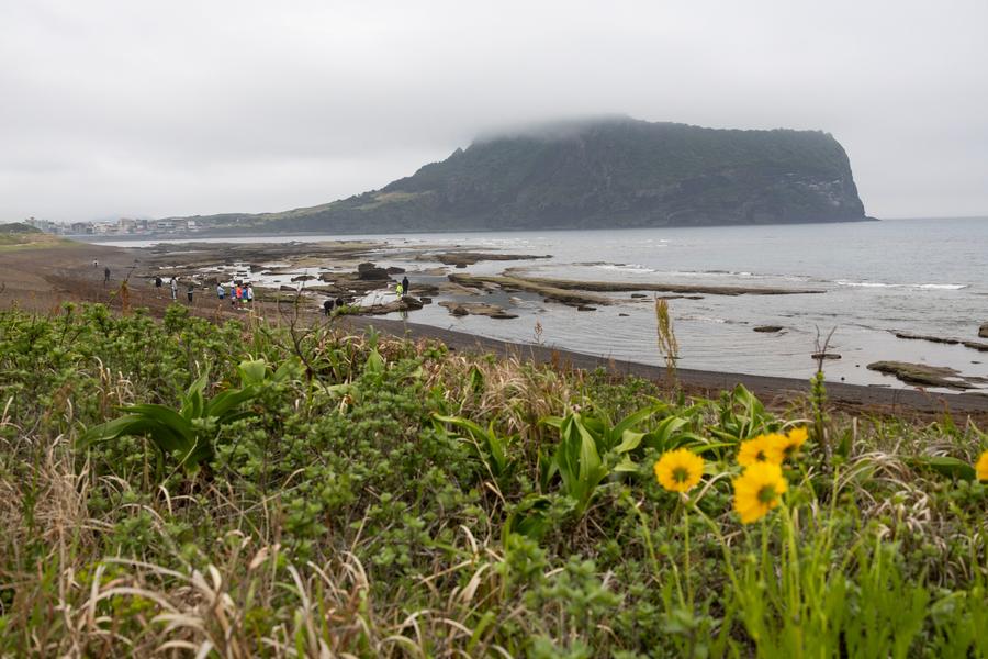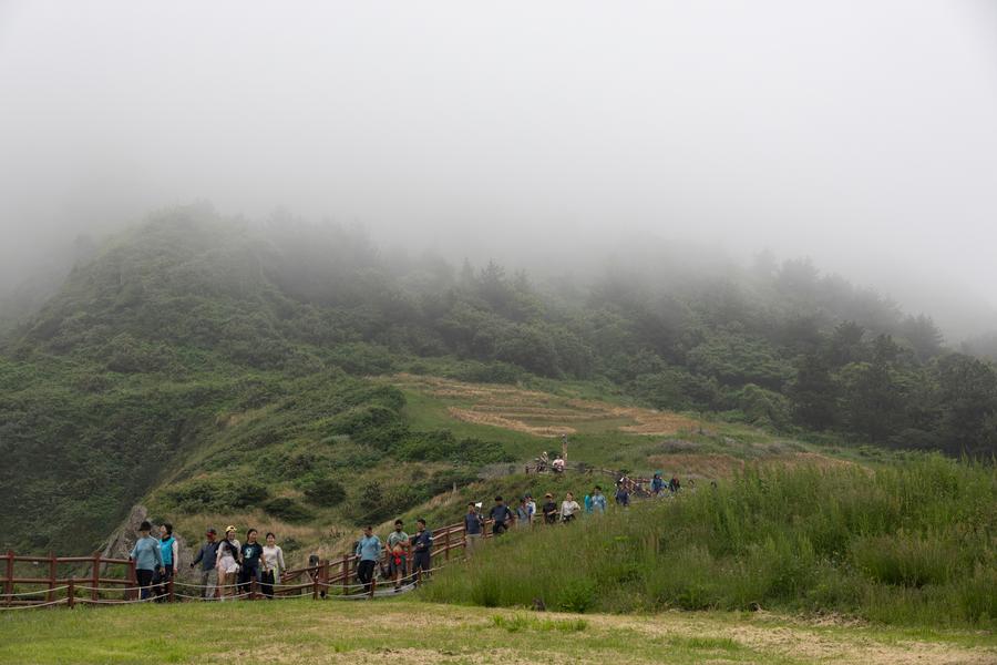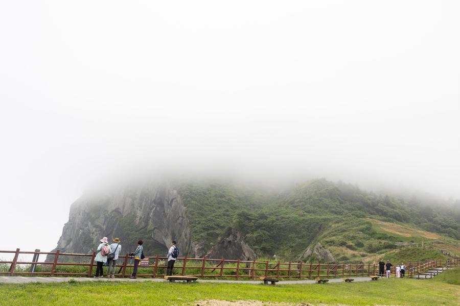 JEJU, South Korea, May 17 (Xinhua) -- People are hiking to see the beautiful landscape through coastal mist at the Seongsan Ilchulbong peak on Jeju Island, South Korea.