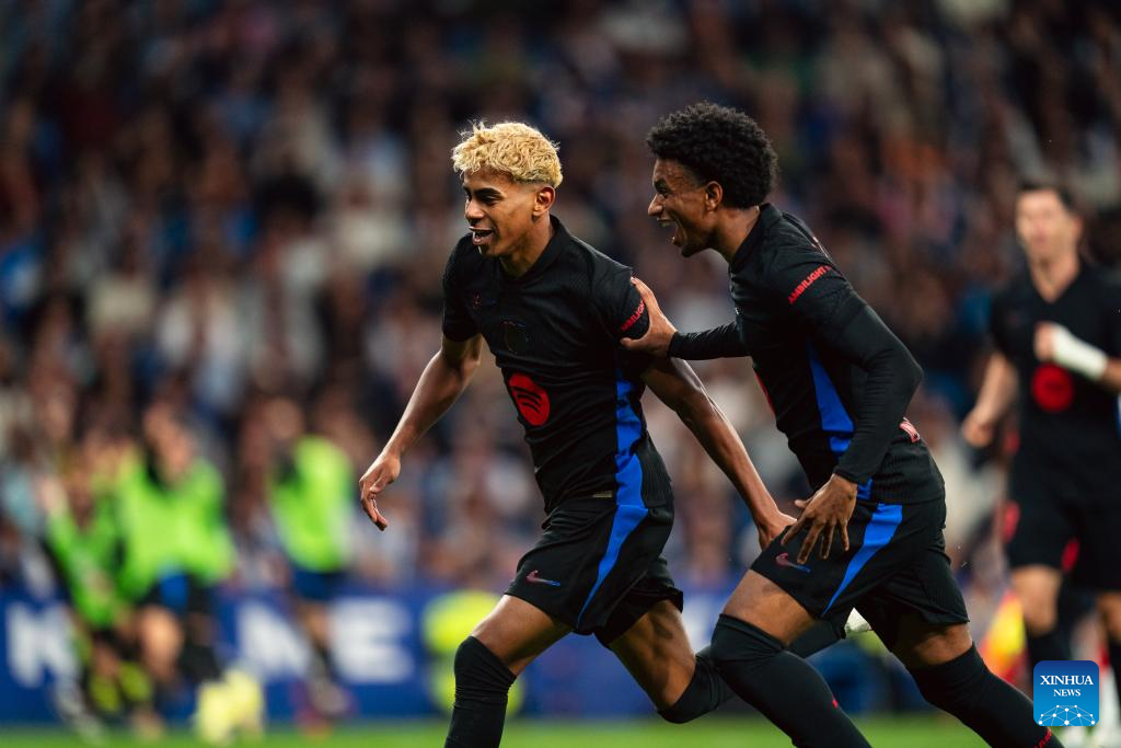 Lamine Yamal (L) of FC Barcelona celebrates a goal during the Laliga football match between FC Barcelona and RCD Espanyol, in RCDE Stadium, Cornella, Spain, on May 15, 2025. (Photo by Joan Gosa/Xinhua)