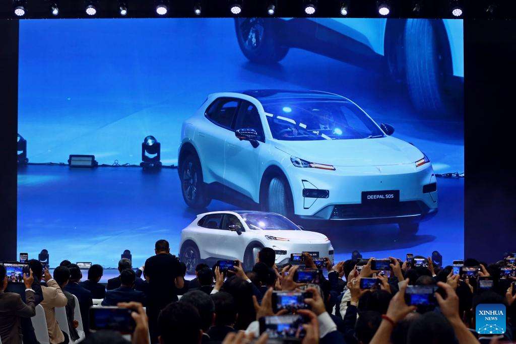 This photo taken on May 16, 2025 shows the roll-off ceremony of the 28.59 millionth vehicle of China's carmaker Changan Automobile in Rayong, Thailand. Changan opened its Thailand plant on Friday, as its 28.59 millionth vehicle rolled off the assembly line in the factory, marking a milestone in the company's global expansion. (Xinhua/Sun Weitong)