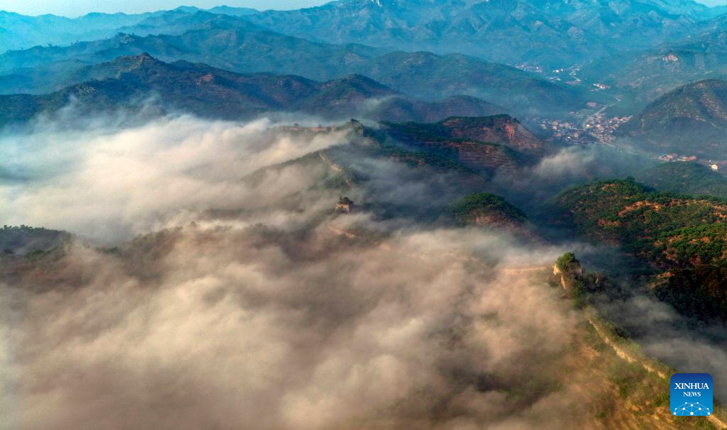 An aerial drone photo taken on May 16, 2025 shows the morning scenery of the Hongshankou Great Wall in Xiaochang Township, Zunhua City of north China's Hebei Province. (Photo by Liu Mancang/Xinhua)