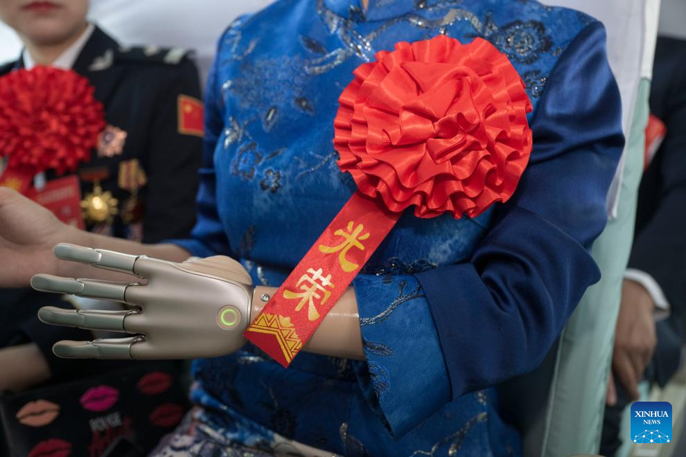 Representative Zhang Chaofan, who wears a bionic arm, heads for the venue of a gathering to commend role models with disabilities and people who have made outstanding contributions in helping those with disabilities in Beijing, capital of China, May 16, 2025. The gathering was held in Beijing on Friday. A total of 200 role models with disabilities, along with 200 outstanding units and 60 exceptional individuals supporting disability services, were honored at the gathering. (Xinhua/Cai Yang)