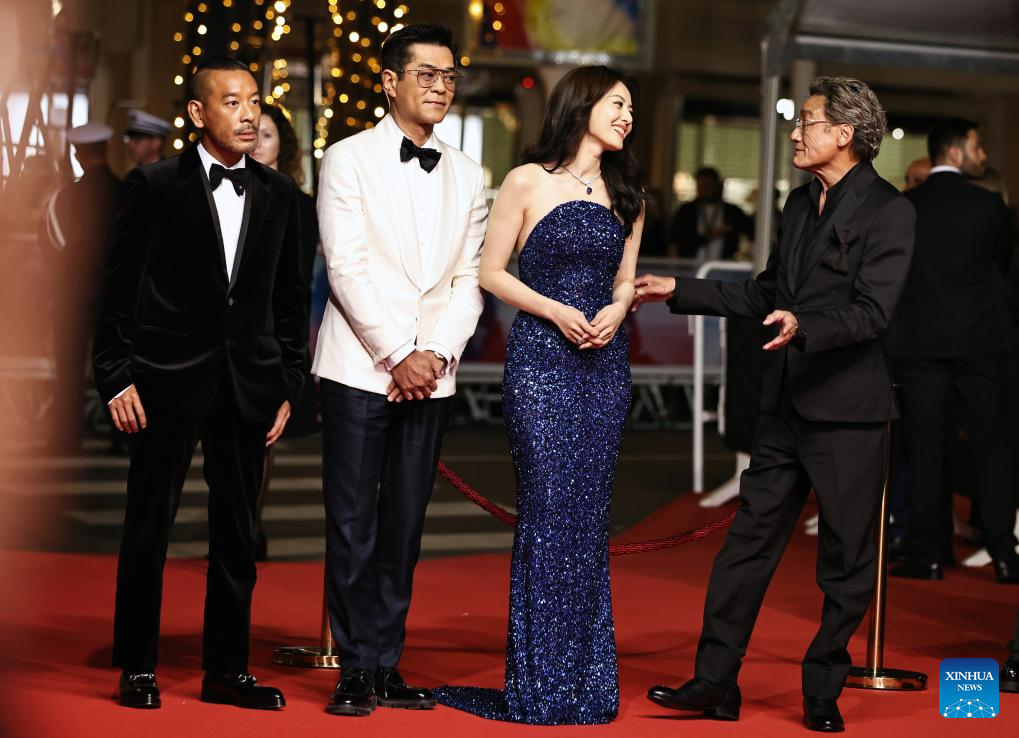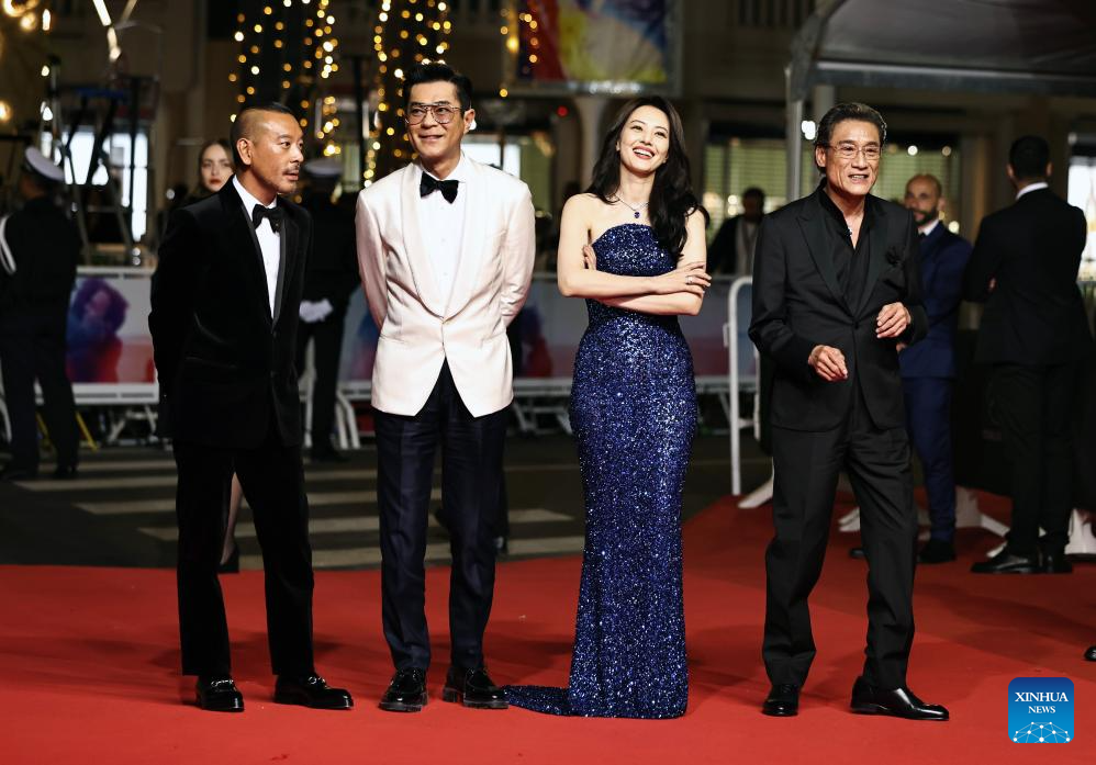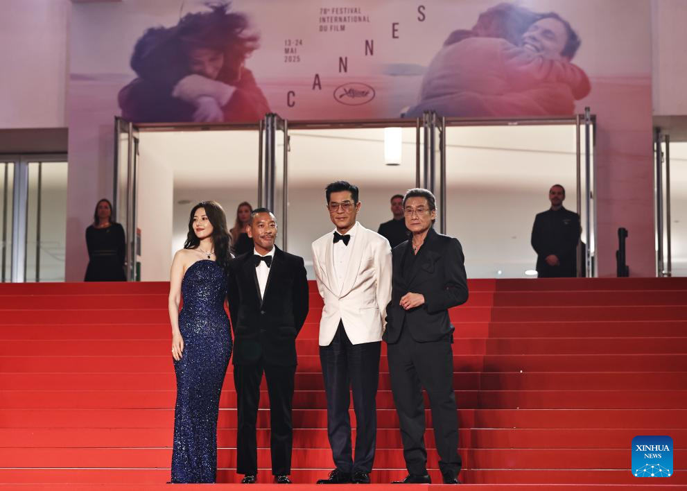 Main cast members Tony Leung Ka Fai, Gao Yuanyuan, Louis Koo and director, screenwriter and producer Juno Mak (R-L), arrive for the premiere of the film "Fung Lam Fo Saan (Sons of the Neon Night)" at the 78th edition of the Cannes Film Festival in Cannes, southern France, on May 16, 2025. (Xinhua/Gao Jing)