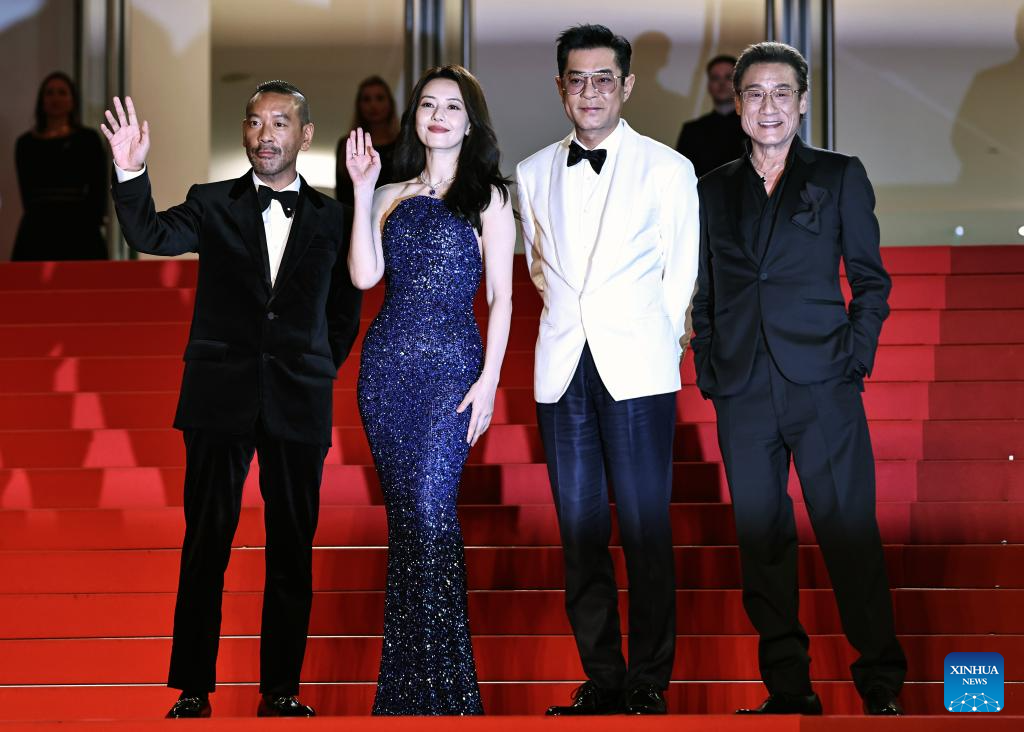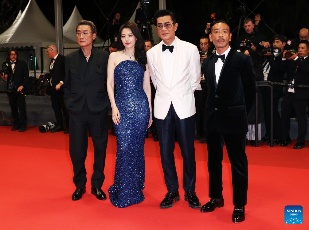 Main cast members Tony Leung Ka Fai, Louis Koo, Gao Yuanyuan and director, screenwriter and producer Juno Mak (R-L) arrive for the premiere of the film "Fung Lam Fo Saan (Sons of the Neon Night)" at the 78th edition of the Cannes Film Festival in Cannes, southern France, on May 16, 2025. (Xinhua/Gao Jing)