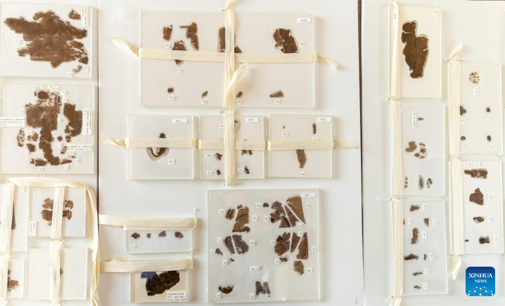 The ancient Zidanku Silk Manuscripts from the Warring States period are displayed during a handover ceremony at the Chinese Embassy in the United States in Washington, D.C., on May 16, 2025. (Xinhua/Hu Yousong)