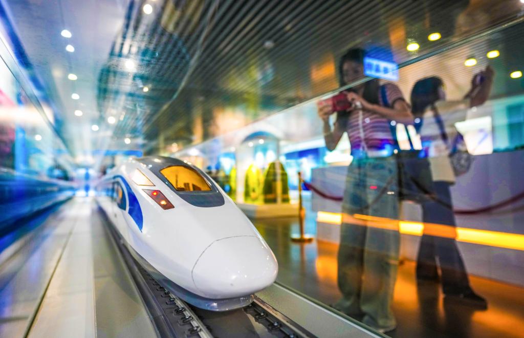 A visitor takes photos of a Fuxing bullet train model at Yunnan Railway Museum in Kunming, southwest China's Yunnan Province, May 16, 2025. (Xinhua/Chen Xinbo)