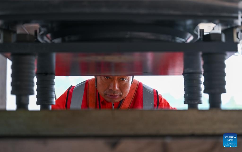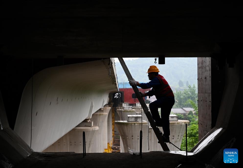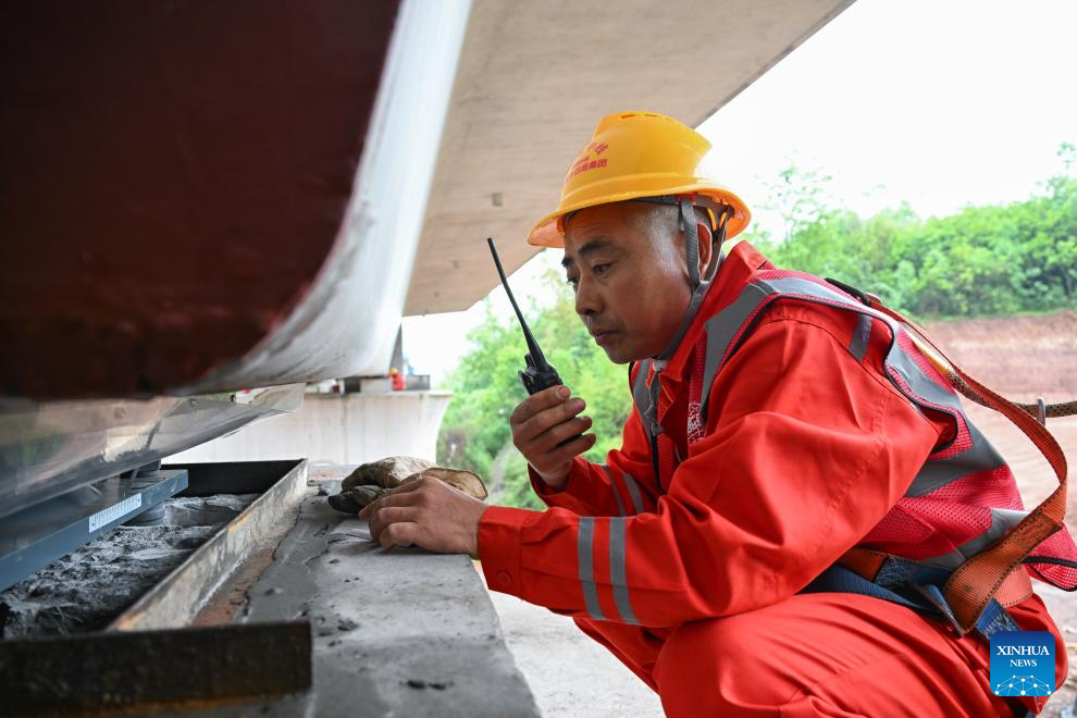 A staff member works during the installation of the first box girder in a super major bridge of Dazu section of the middle line of Chengdu-Chongqing railway in Dazu District of southwest China's Chongqing Municipality, May 16, 2025. The first box girder weighting 697 tonnes at a length of 32.6 meters was accurately set up on Friday.
