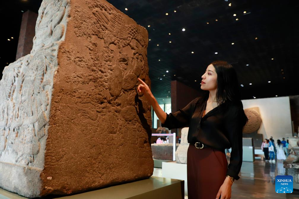A staff member introduces an exhibit at the National Museum of Anthropology in Mexico City, capital of Mexico, on May 15, 2025. The National Museum of Anthropology is located at Chapultepec Park in Mexico City and is one of the largest and most popular museums in Mexico, showcasing Mexico's cultural heritage from prehistoric times. Internatioanl Museum Day is celebrated on May 18 every year. (Photo by Pool Contreras/Xinhua)