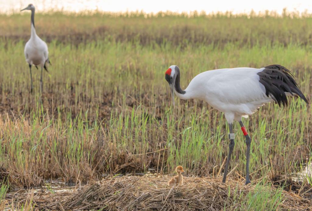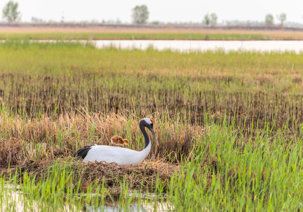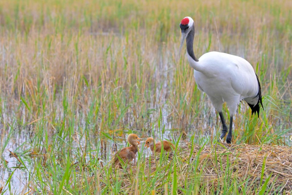 With a total area of 2,100 square kilometers, the reserve is dubbed "home of red-crowned cranes" in China, and serves as the world's largest red-crowned crane habitat and largest captive-bred red-crowned crane rewilding base.