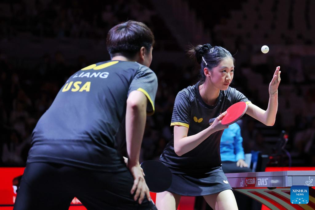 Jishan Liang and Amy Wang (R) compete during the mixed doubles round of 64 match between Wang Chuqin/Sun Yingsha of China and Jishan Liang/Amy Wang of the United States at ITTF World Table Tennis Championships Finals Doha 2025 in Doha, Qatar, May 18, 2025. (Xinhua/Liu Xu)