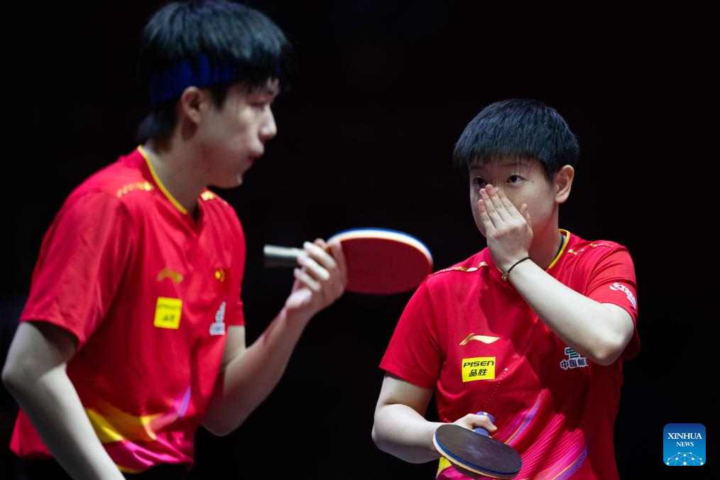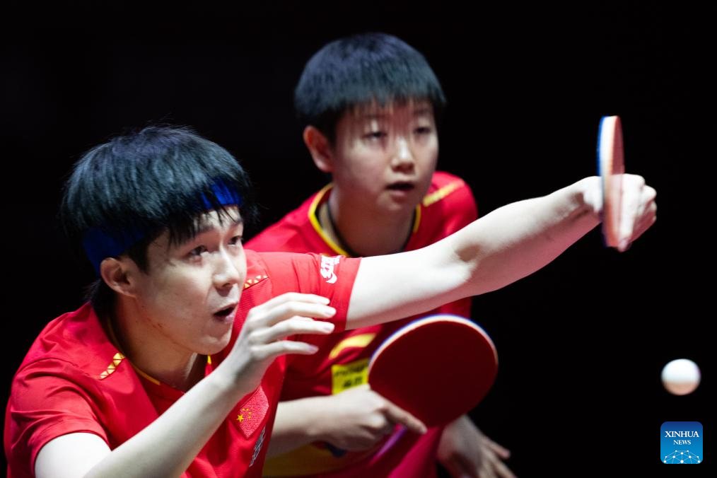 Wang Chuqin (L) and Sun Yingsha compete during the mixed doubles round of 64 match between Wang Chuqin/Sun Yingsha of China and Jishan Liang/Amy Wang of the United States at ITTF World Table Tennis Championships Finals Doha 2025 in Doha, Qatar, May 18, 2025. (Xinhua/Liu Xu)