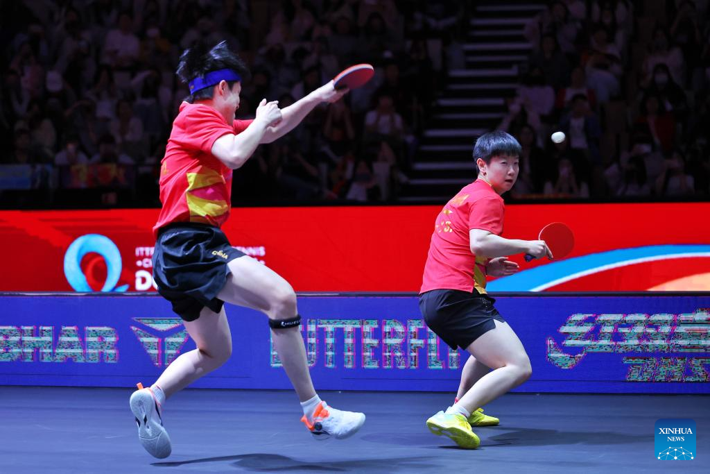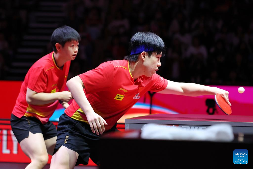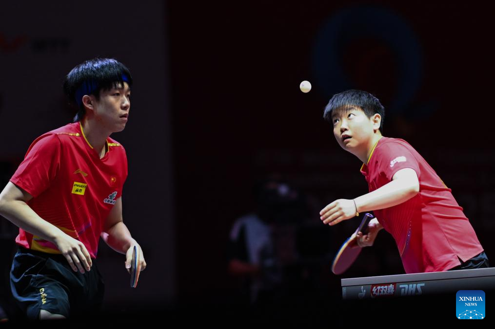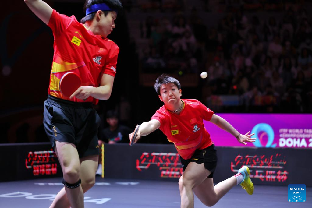 Wang Chuqin (R) and Sun Yingsha compete during the mixed doubles round of 64 match between Wang Chuqin/Sun Yingsha of China and Jishan Liang/Amy Wang of the United States at ITTF World Table Tennis Championships Finals Doha 2025 in Doha, Qatar, May 18, 2025. (Xinhua/Liu Xu)