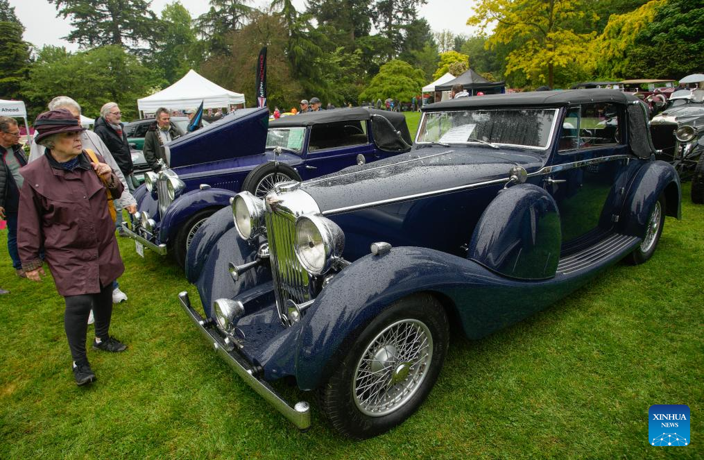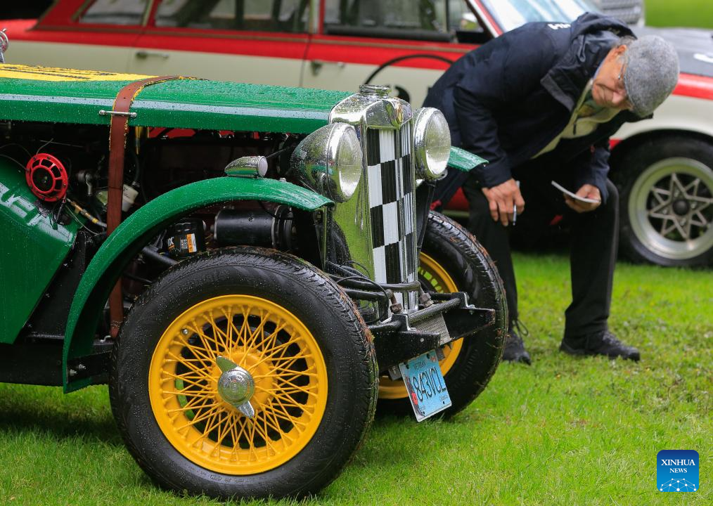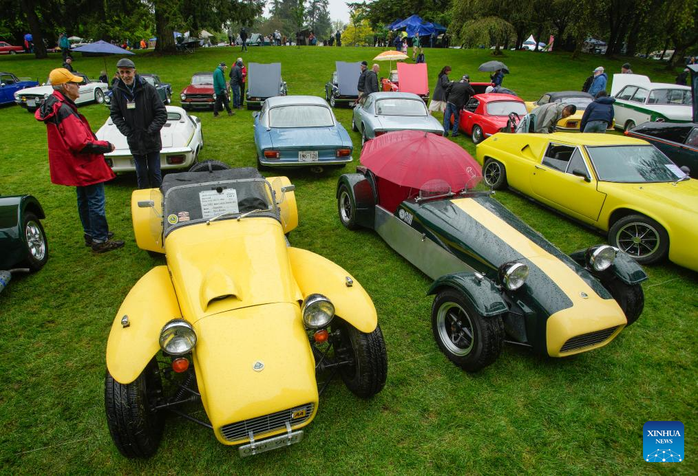People view classic cars displayed during the 2025 Vancouver All British Field Meet classic car show at VanDusen Botanical Garden in Vancouver, British Columbia, Canada, May 17, 2025. The annual event featured over 400 classic British vehicles, attracting car enthusiasts and collectors from across the region. (Photo by Liang Sen/Xinhua)