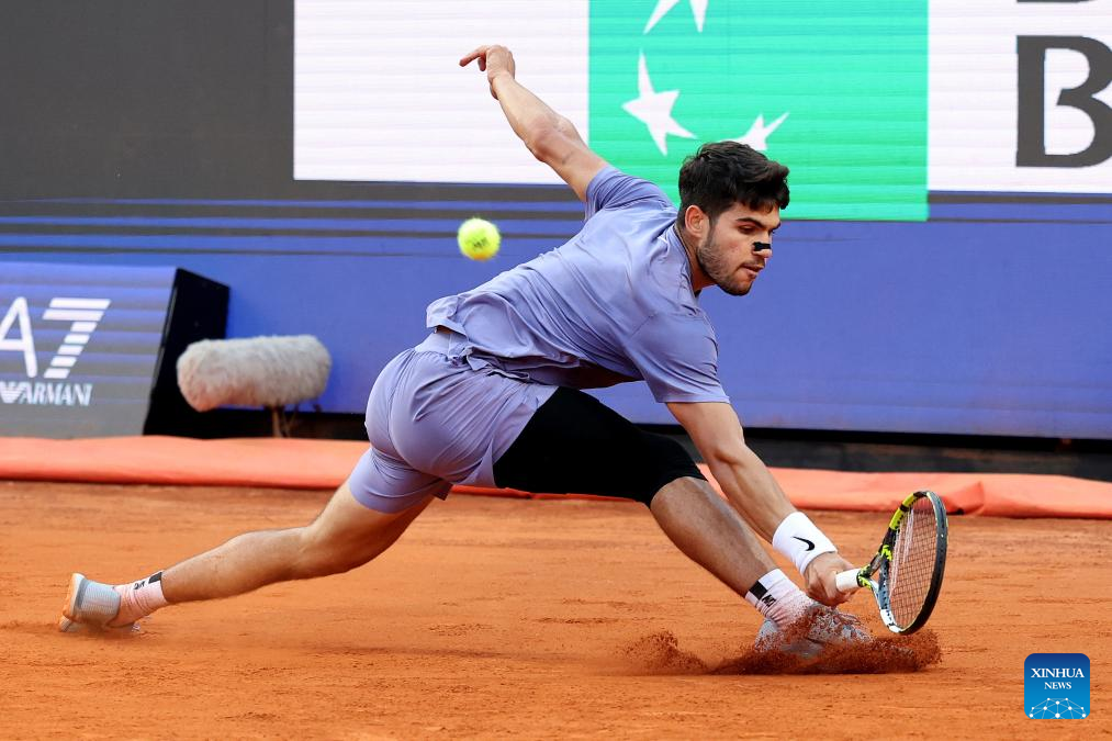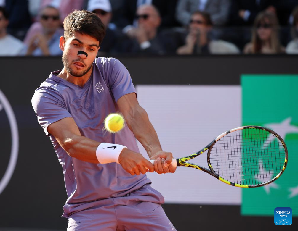 Carlos Alcaraz of Spain hits a return during the men's singles final match against Jannik Sinner of Italy at the ATP Italian Open in Rome, Italy, May 18, 2025. (Photo by Elisa Lingria/Xinhua)