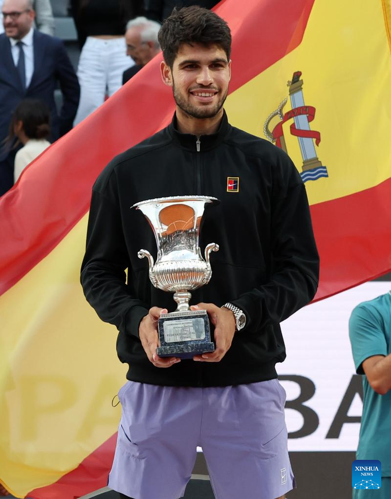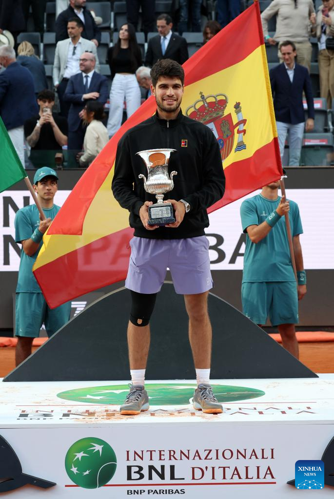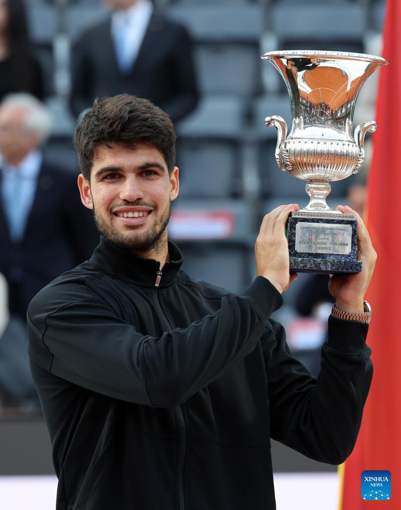 Carlos Alcaraz of Spain celebrates with the trophy after winning the men's singles final match against Jannik Sinner of Italy at the ATP Italian Open in Rome, Italy, May 18, 2025. (Photo by Elisa Lingria/Xinhua)