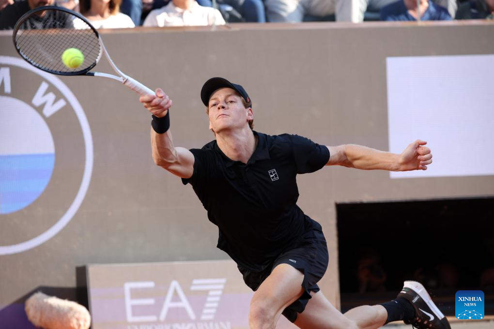 Jannik Sinner of Italy hits a return during the men's singles final match against Carlos Alcaraz of Spain at the ATP Italian Open in Rome, Italy, May 18, 2025. (Photo by Elisa Lingria/Xinhua)
