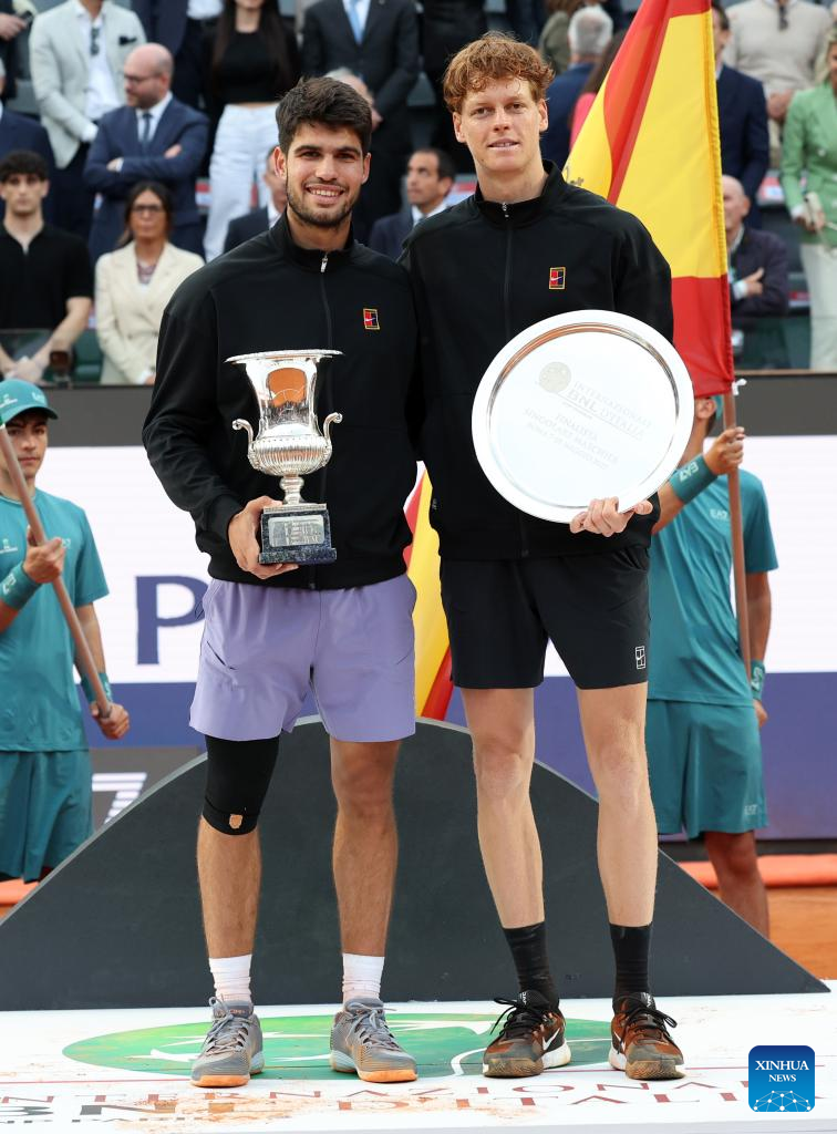 Carlos Alcaraz (L) of Spain and Jannik Sinner of Italy pose with their trophies after the men's singles final match at the ATP Italian Open in Rome, Italy, May 18, 2025. (Photo by Elisa Lingria/Xinhua)