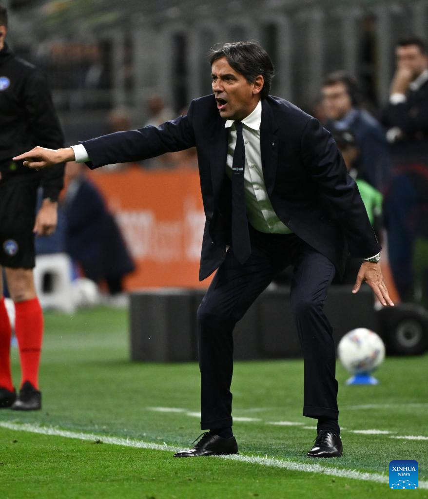 Inter Milan's head coach Simone Inzaghi instructs during a Serie A football match between Inter Milan and Lazio in Milan, Italy, May 18, 2025. (Photo by Alberto Lingria/Xinhua)