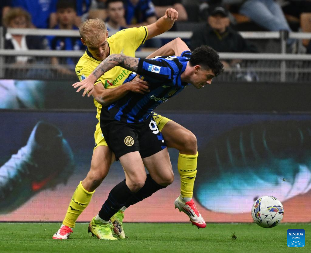 Inter Milan's Alessandro Bastoni (R) vies with Lazio's Gustav Isaksen during a Serie A football match between Inter Milan and Lazio in Milan, Italy, May 18, 2025. (Photo by Alberto Lingria/Xinhua)