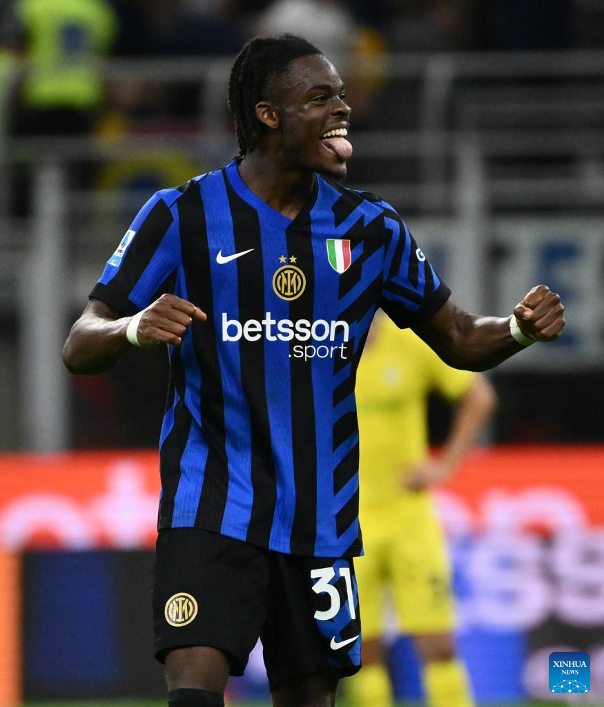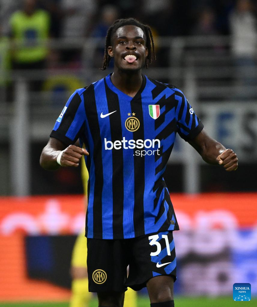 Inter Milan's Yann Bisseck celebrates his goal during a Serie A football match between Inter Milan and Lazio in Milan, Italy, May 18, 2025. (Photo by Alberto Lingria/Xinhua)