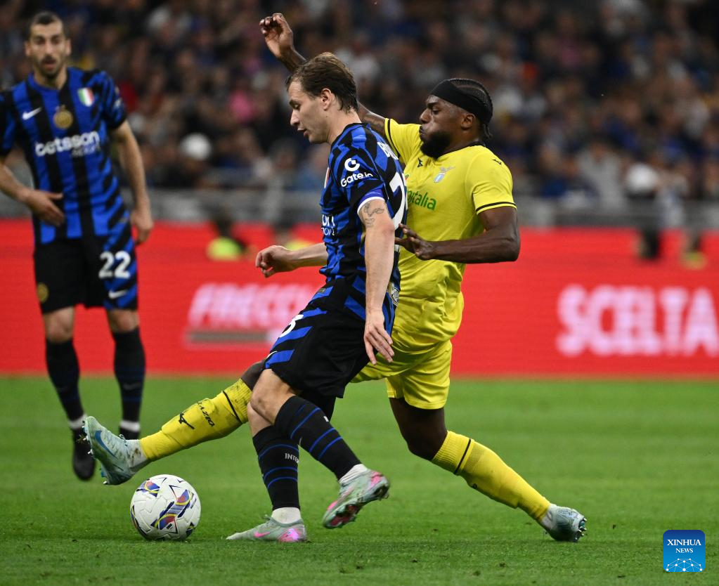 Inter Milan's Nicolo Barella (L) vies with Lazio's Nuno Tavares during a Serie A football match between Inter Milan and Lazio in Milan, Italy, May 18, 2025. (Photo by Alberto Lingria/Xinhua)