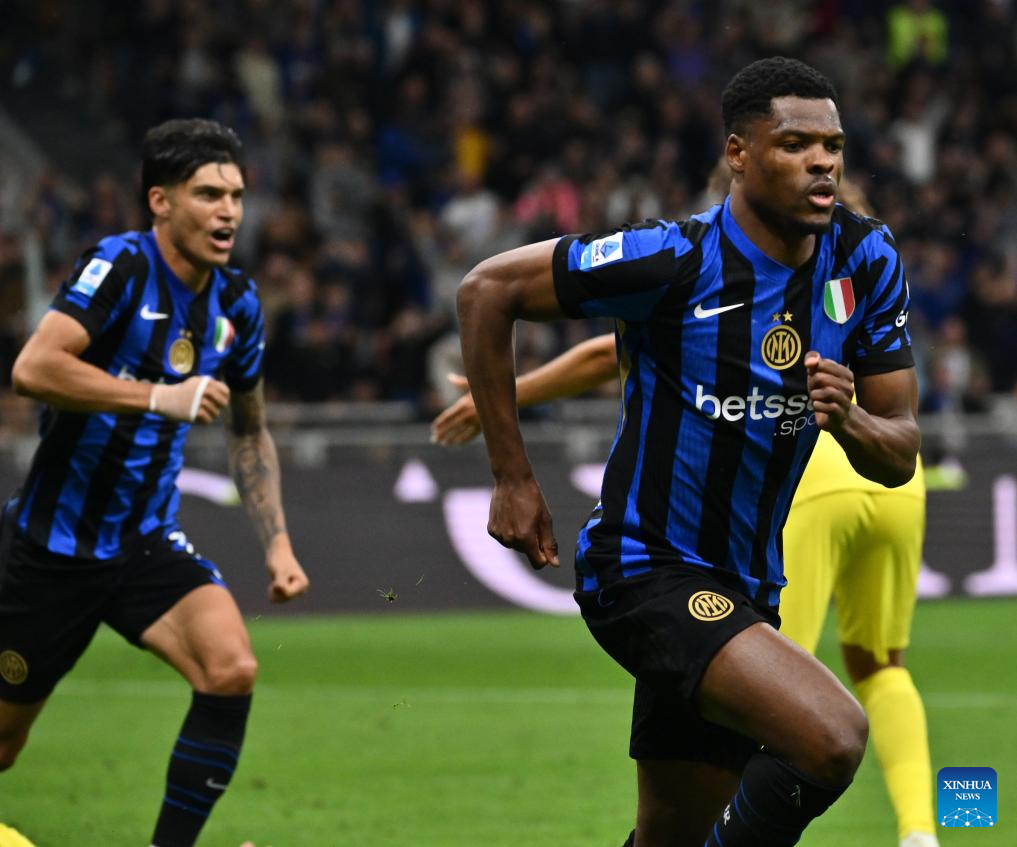 Inter Milan's Denzel Dumfries (R) celebrates his goal during a Serie A football match between Inter Milan and Lazio in Milan, Italy, May 18, 2025. (Photo by Alberto Lingria/Xinhua)