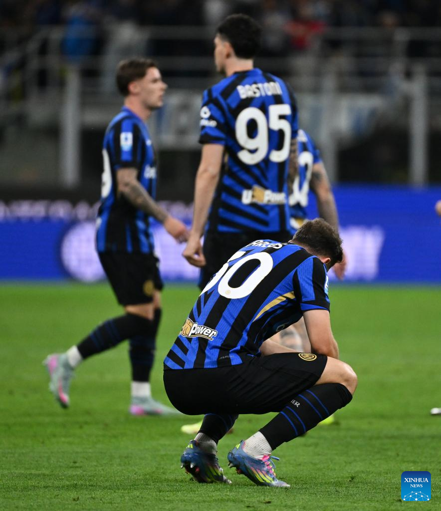Inter Milan's players react after a Serie A football match between Inter Milan and Lazio in Milan, Italy, May 18, 2025. (Photo by Alberto Lingria/Xinhua)