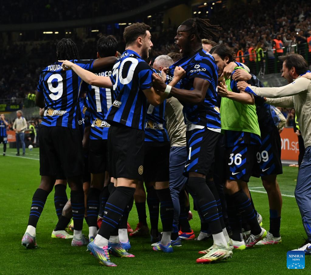 Players of Inter Milan celebrate a goal by Denzel Dumfries during a Serie A football match between Inter Milan and Lazio in Milan, Italy, May 18, 2025. (Photo by Alberto Lingria/Xinhua)