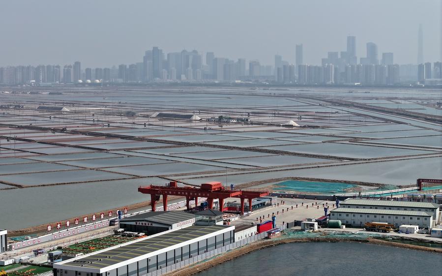 An aerial drone photo taken on May 19, 2025 shows the construction site of the Tianjin-Weifang High-Speed Railway's Jingu Haihe Tunnel project in north China's Tianjin. (Xinhua/Li Ran)