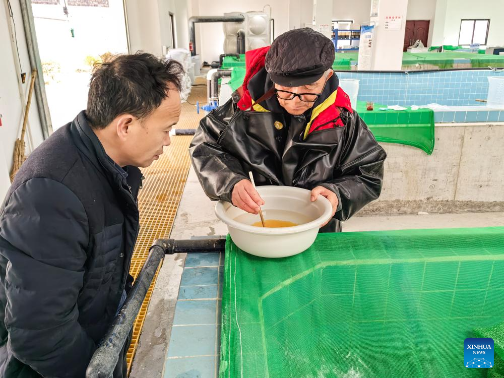 Researchers select fertilized eggs for second-filial-generation Sichuan taimen at a fish proliferation and release station operated by a company under PowerChina Hydropower Development Group Co., Ltd. in Barkam City of Aba Tibetan and Qiang Autonomous Prefecture, southwest China's Sichuan Province, March 2, 2025.