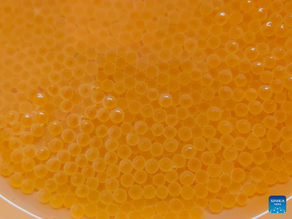 This photo shows fertilized eggs for second-filial-generation Sichuan taimen at a fish proliferation and release station operated by a company under PowerChina Hydropower Development Group Co., Ltd. in Barkam City of Aba Tibetan and Qiang Autonomous Prefecture, southwest China's Sichuan Province, March 2, 2025.