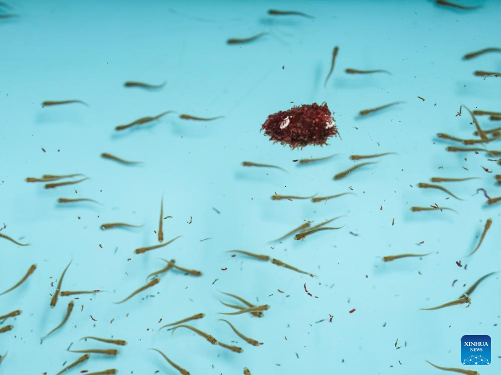 The survival rate of this latest batch of fry has stabilized at over 90 percent, which lays a solid ground for efforts to restore the wild population of this endangered fish species, and ensures high-quality reserves for future proliferation and release work. (Xinhua/Wang Xi)
